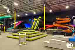 Indoor park, featuring several slides, plus a basketball court and a toddler area.